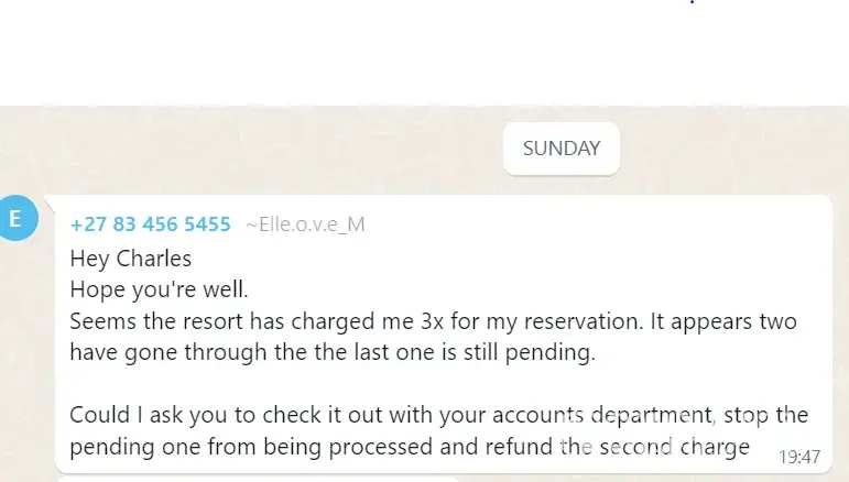 I'm not sure what type of establishment you're running. Or why it would take you over a week to run a simple recon. You charged me THREE TIMES for my reservation.