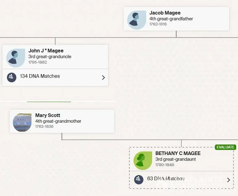 Jacob Magee and Mary Scott Magee do show up as my 4th greatgrandparents, but John, jr. and Bethaney Cordelia DO NOT SHOW UP.