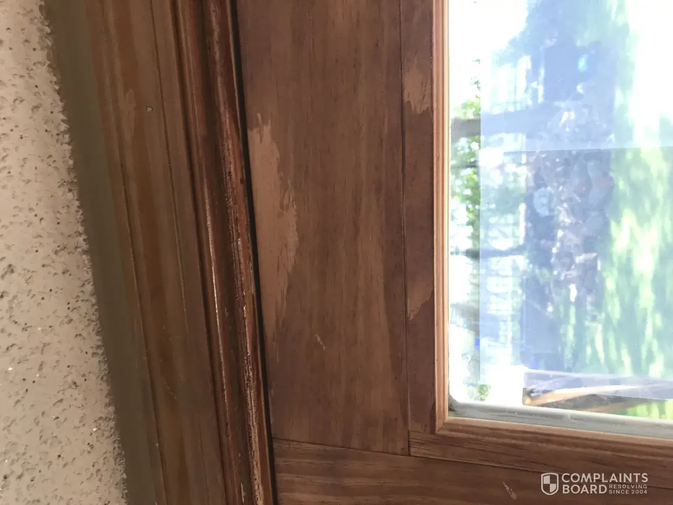 We ordered a henged patio door unfished pine interior.. Door has 3 coats of stain and I noticed on the trim on the top is a different color and wood texture is different.. So the color isn't the same on other parts of the door.. Trim looks defected.. I would like someone from anderson to come and take a look.. Wr purchased the door from home depot and they told me to contact you guys..:i'm enclosing pictures of the problem.. Please contact by email at candlenut2 @comcast.net or by phone at [protected]...