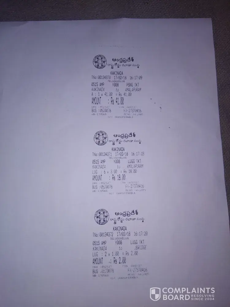 There are non-stop bus services Kakinada to Amalapuram to and fro. As per people requirement, If Express buses are are not available, Depo managers are providing Teluguvelugu or Deluxe or Luxury. but charges are different if they provide Teluguvelugu bus services as non-stop service, conductors are collecting Express charges. And that is not fair, if they are collecting according to bus luxrurios means Express cost 61/-₹ if it is non-stop are limited halts, Deluxe is more, Luxury is more. Teluguvelugu fare is 42/-₹ for limited halts. while they are providing Teluguvelugu as non-stop why they are collecting/Charging Express charges? And ticketing is also a fraud, I have proof I will show you. (passenger tkt cost is 41/-₹ and luggage tkt cost is 18/-₹ and 2/-₹with out luggages) why they are collecting luggage charges.