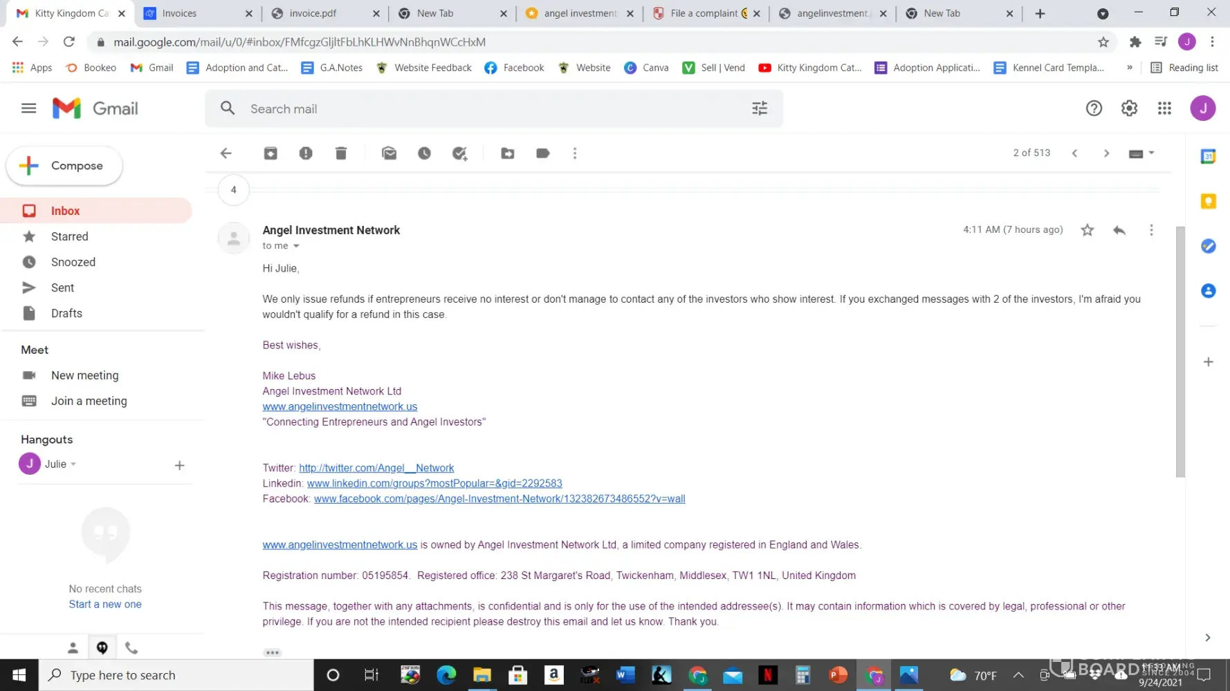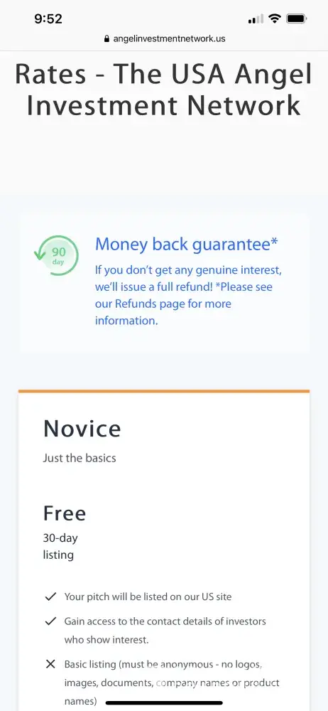 I signed up in June of 2021 to promote my business on Angel Investment Network. Not only did I sign up for their service, but also signed up for expert review of my pitch and I was encouraged. Then the site guaranteed a refund if no investment offers were made in the three month trial. In the three months I was posting on the website, I had two legitamate people contact me and two scammers contact me as well. Of the two good contacts they stated up front that they though I had a great idea for a business, but was not interested in investing. The other good contact thanked me for the good community service I was doing, but up front said that he would not invest. Others were scammers. When I asked for a refund, I was told that the two encouragers qualified as contacts. I explained that I was to be guaranteed offers in three months, they renegged and I got bupkis.
