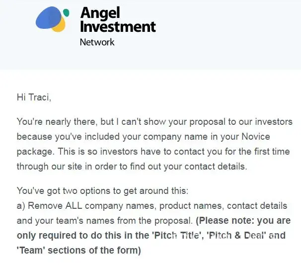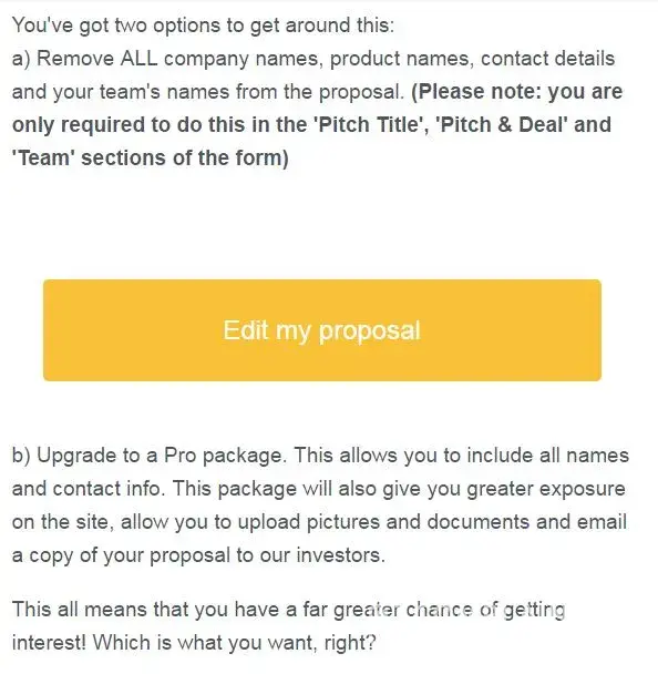 One day later, I get an email from AIN that I must remove the name of my new company from the proposal title and pitch & deal tab, and remove my name and anyone else's name from my "company team". I tried to do this. I was able to remove all names but when I tried to remove my company name from the proposal title, it would not change no matter how many times I changed it and clicked SAVE. Apparently this is to push me to spend usd200 for the "expert help".