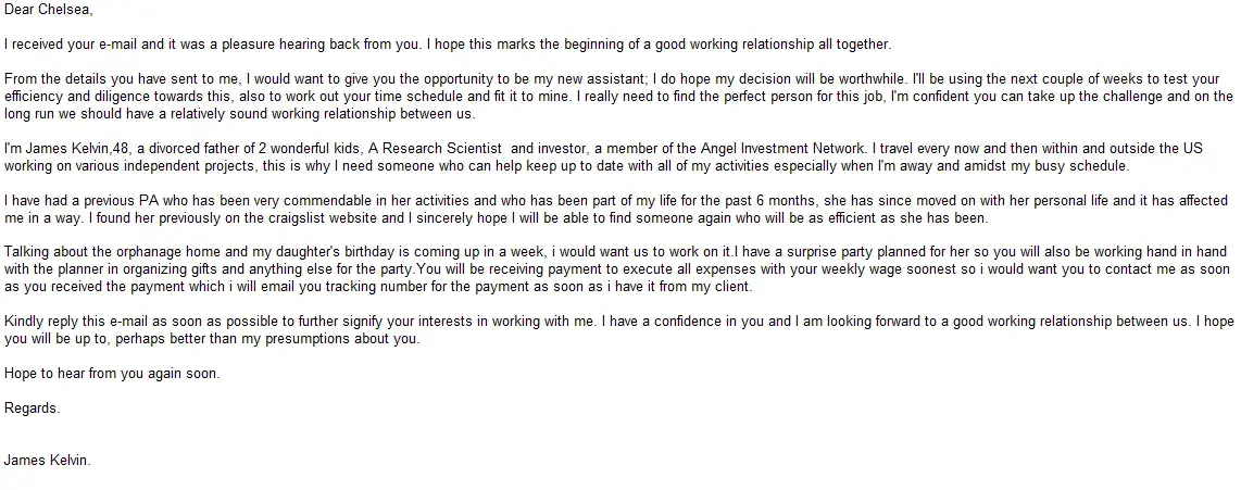 Thanks for your interests in the PA position, I will deeply appreciate all genuine efforts to help me monitor and keep up to date with all my activities.I have had a previous PA who has been very commendable in her activities and who has been part of my life for the past 6 months, she has since returned to her country. I sincerely hope I will be able to find someone again who will be as efficient as she has been.