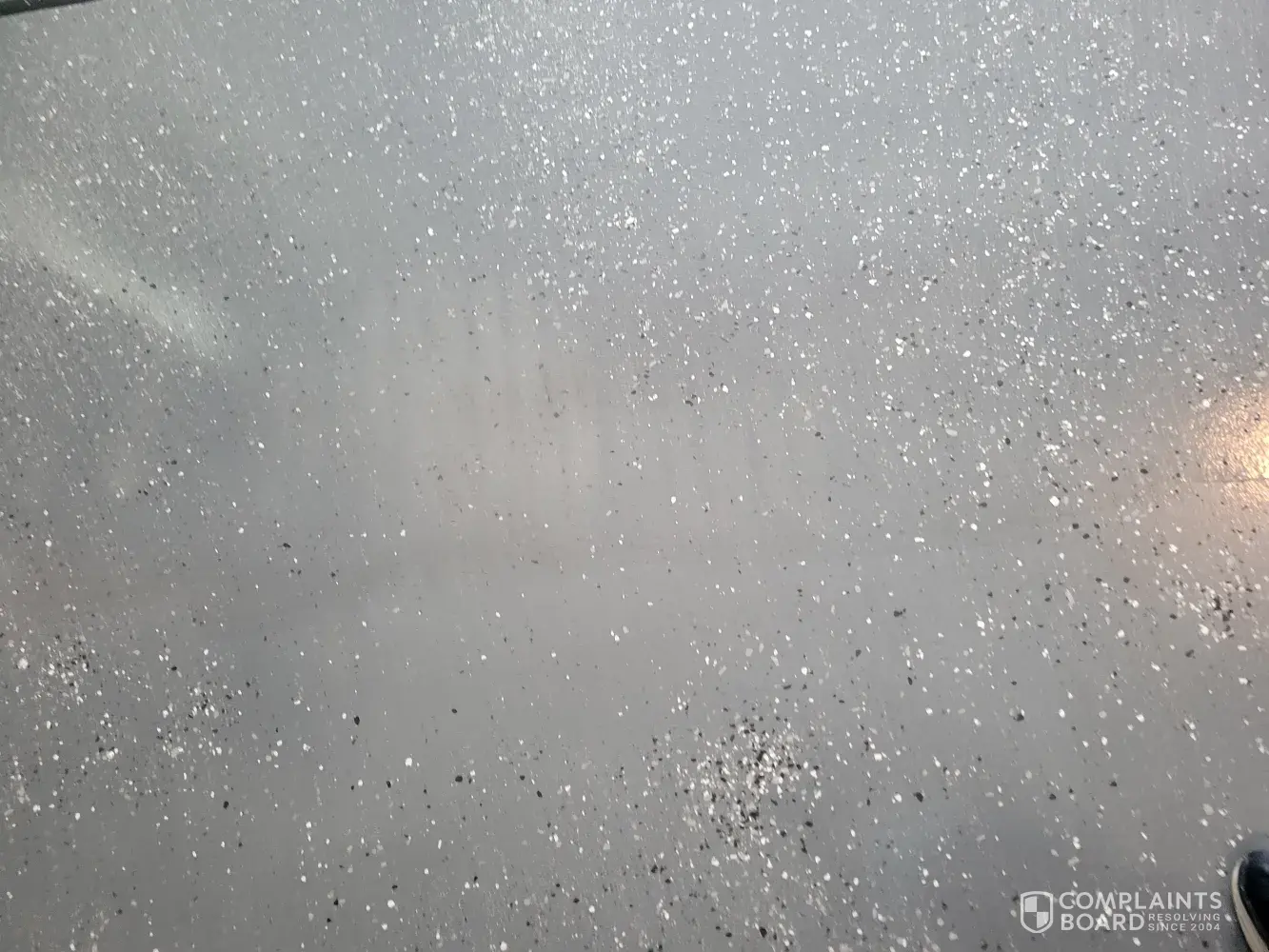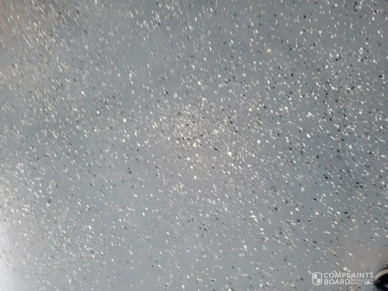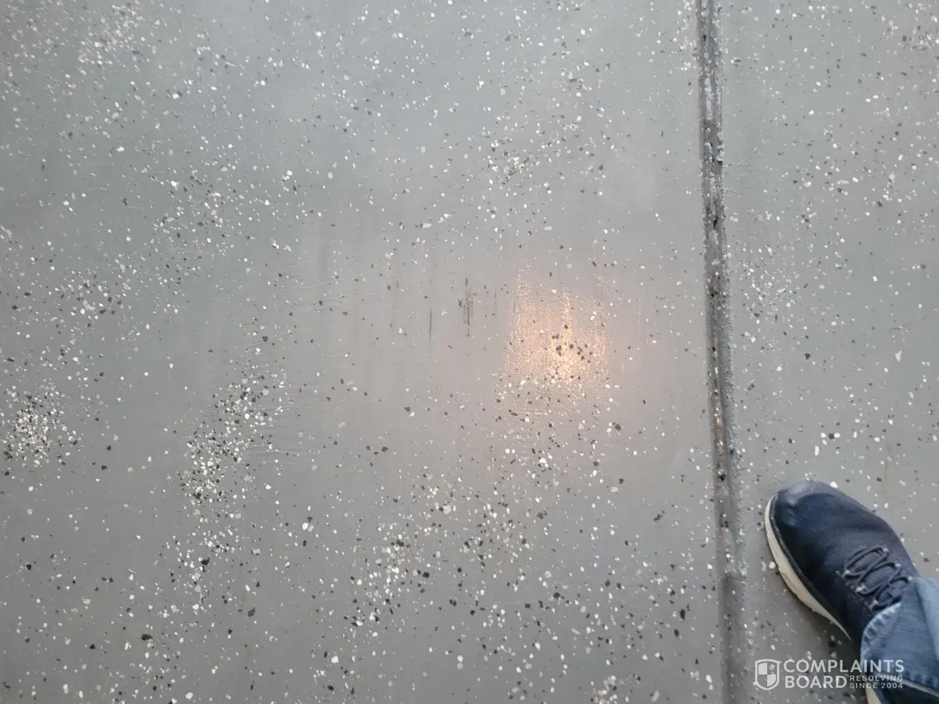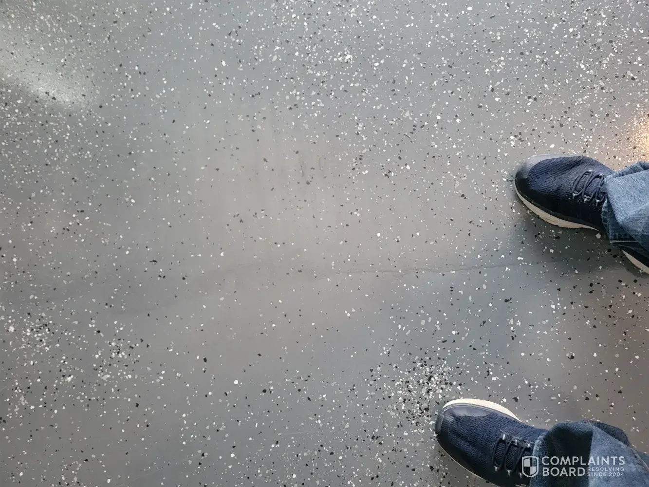 The finish is very uneven, the flaking is clumpy, uneven and looks like a child did it. There are stop marks in the finish, there should be a clear topcoat on top of the flakes and that was not done. The finish was supposed to be a commercial grade, to hold up to things being moved around in a garage as well as my truck going in and out. The finish is scratching and already showing wear and it's only been a couple of weeks. You can see the tire wear, were my truck goes in and out. You can see the cracks in the concrete that were supposed to be filled and covered, not visible after the application was complete.
