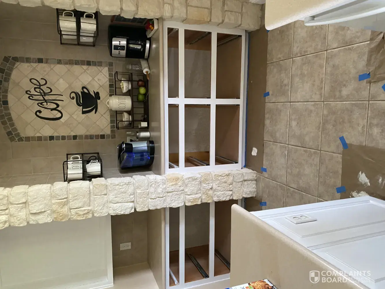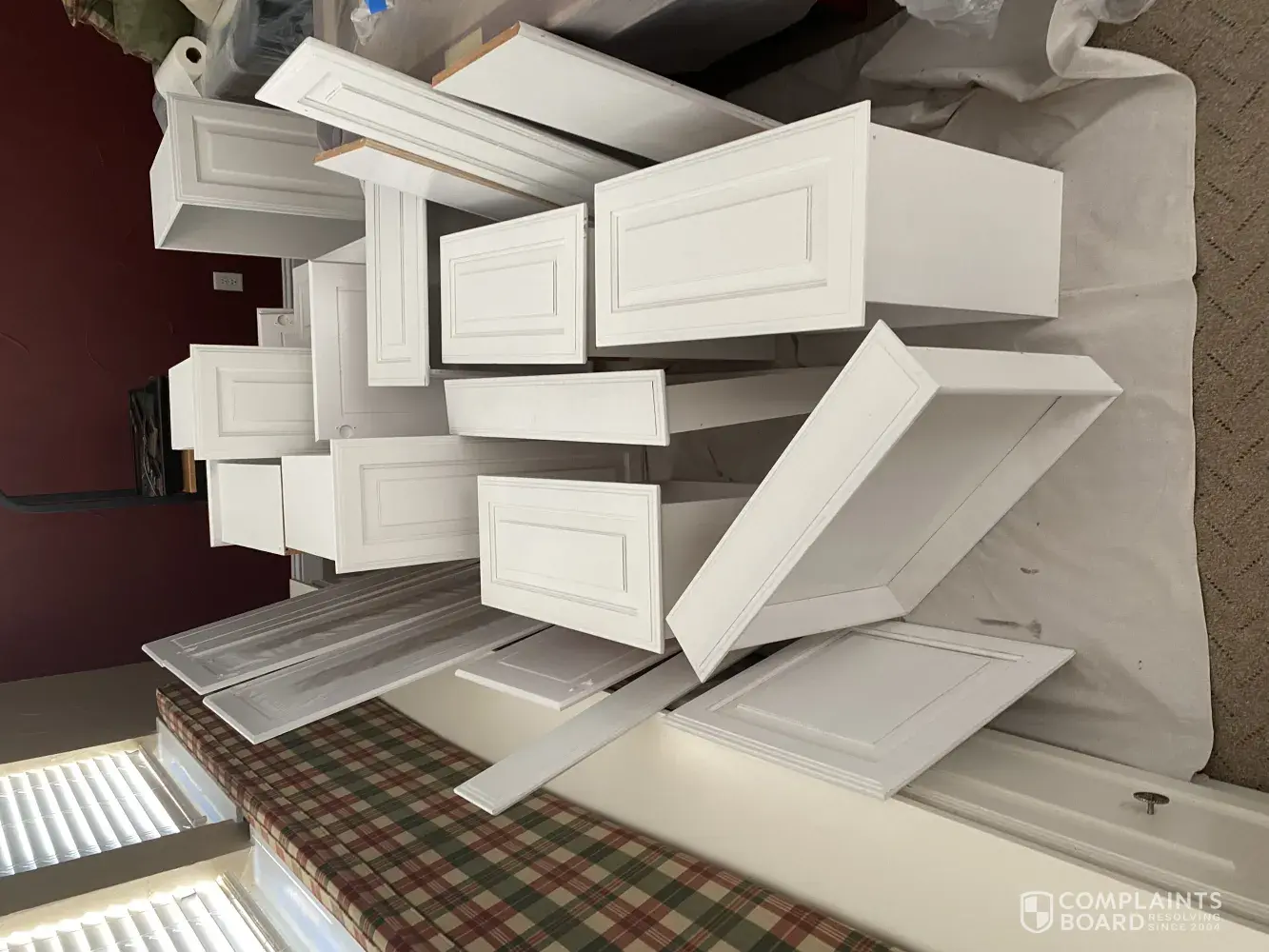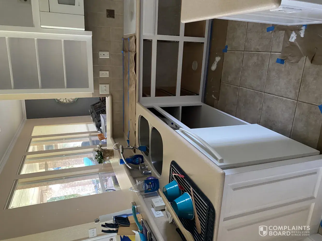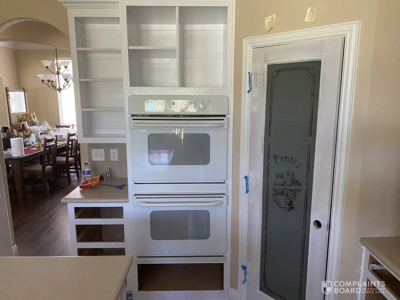 Troy asked for more money to do what was already in the contract. We said no. He pulled his helper off the job. Had already been paid $6800.00 (50%). He hadn't completed a 1/4 of project. Because of the damage to kitchen/drawers/doors new contractor has to sand everything and start all over. Contractor brushed cabinets, didn't spray. Didn't completely mask off walls and trim as stated in contract. Could see the nail hole repairs through the one coat of paint. Sheriff had to be called to get our cabinet doors and drawers returned. Troy stacked them by the garage door. All of them scratch/dented. Troy Smith on his in walked off the job with $6800.00. As stated by the sheriff to do, a suit has been filed against him.