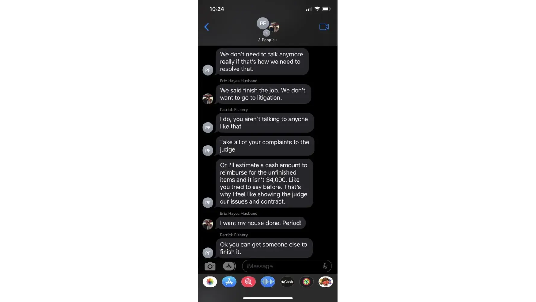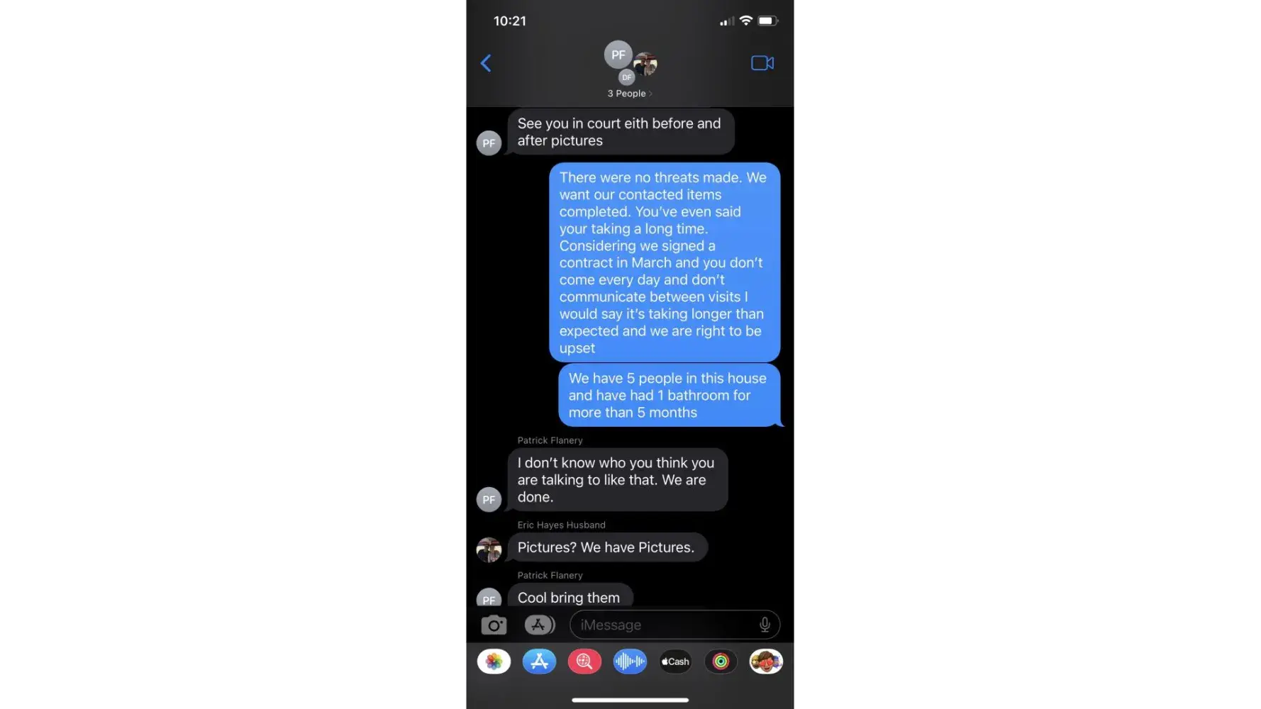 We contracted with Patrick's Handyman and Remodeling to completely remodel 2 full baths, retile 2200 square feet, redo ceiling, paint and replace interior doors. After 6 months they still were not finished and never communicated when they were coming (which was an hour or 2 a couple days a week.) We finally confronted them on it and they quit our job with a full master bath completely demo'd and "punch out" work throughout the house left to be completed. I am attaching screen shots of our text messages showing Patrick's unreasonable and inappropriate responses to our inquiry. They not only quit but left garbage and damage to our personal belongings.
