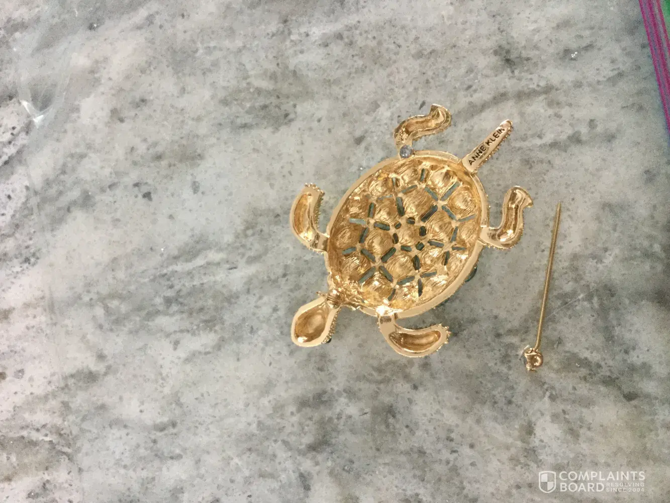 I purchased an Anne Klein turtle pin from The Bay, St. Albert, January 17, 2018. On March 19 the pin broke off. I had this pin on a coat that I didn't even wear every day. I took it to a jeweler however they said they can't fix it as it's not gold. The Bay won't do anything about it. I love the pin however am extremely disappointed that it fell apart within three months. I'd love to have another one if this one can't be repaired. I've purchased a few AK watches and other products over the years and have been happy with them.