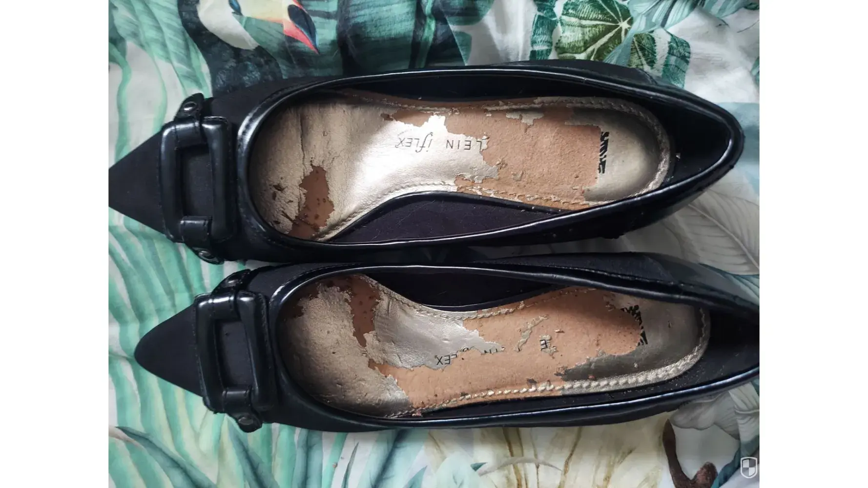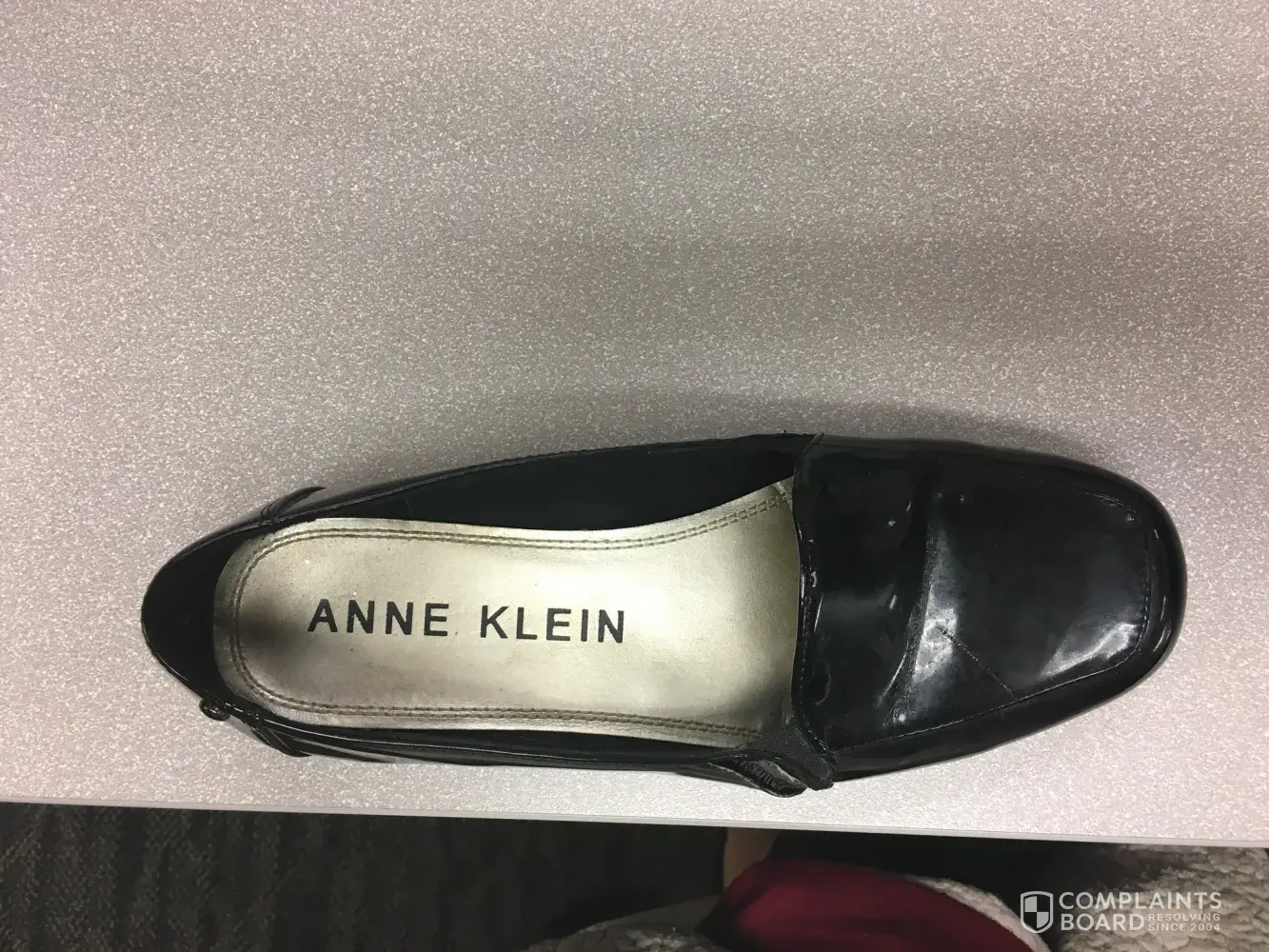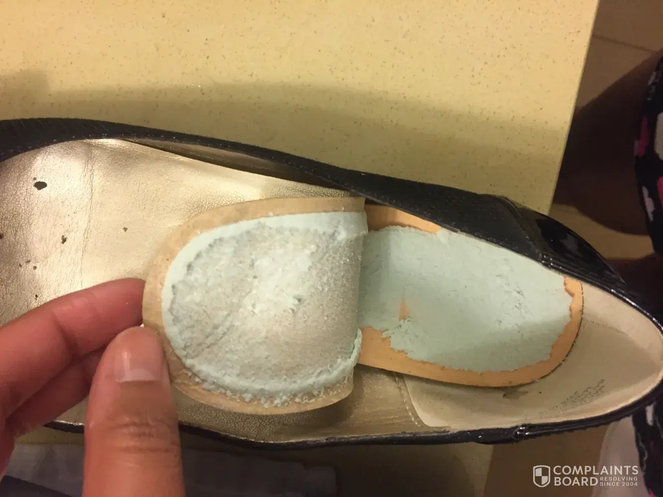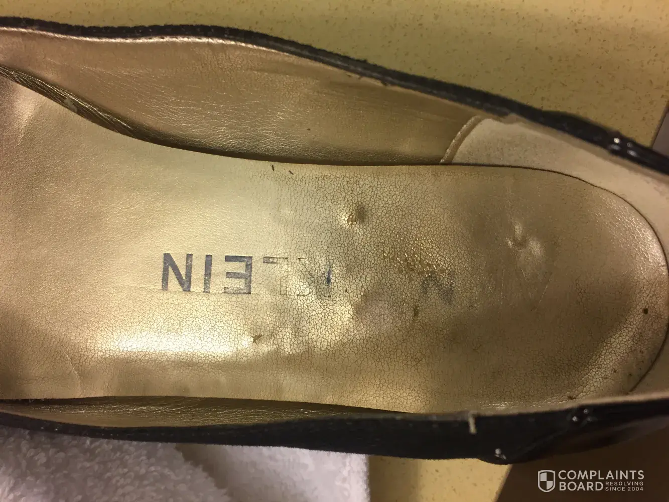I purchased a pair of Anne Klein black dress Flex shoes at DSW earlier this year. After only wearing them 1 time -the gold paint on the inside of the shoes came off all over my feet! Little gold flecks of paint everywhere! I am very disappointed as the shoes are comfortable. Please advise. Thank you. 😀