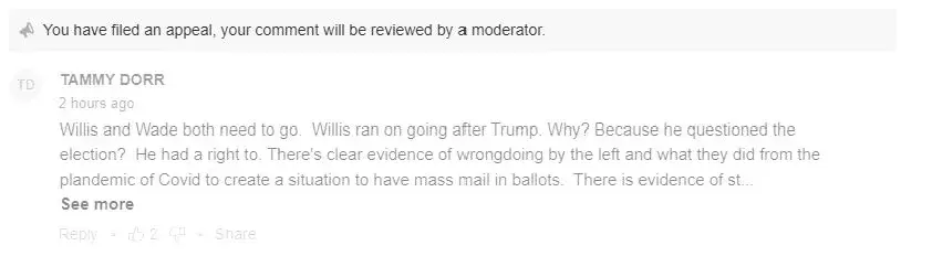 I have made several comments on the story about Willis and they have been denied, including my appeal. There was NOTHING wrong with what I said. The ONLY thing wrong is that I am a conservative, a President Trump voter (and will vote for him again in November) and that is why my comments are being targeted. I do NOT appreciate being targeted by another...