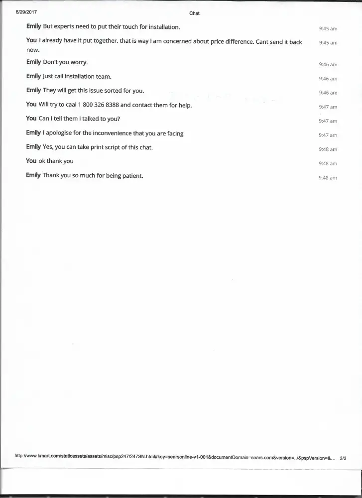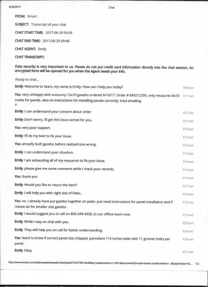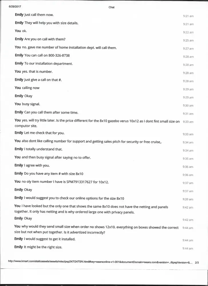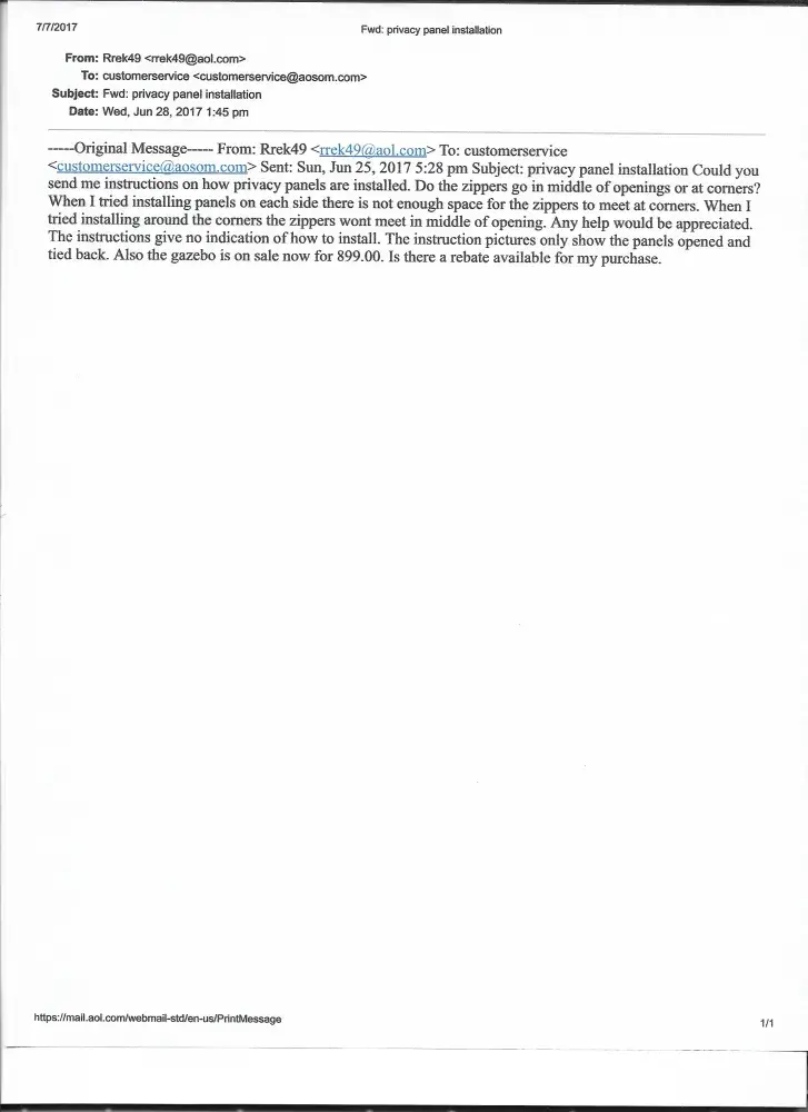 On 6-10-17 I purchased a outsunny 12x10 outdoor patio gazebo online from k-mart. Order # [protected] Sales ch # [protected]. I cannot get a support from Aosom for the installation instructions or the installation department. I have tried several times thou e-mail and got 1 response asking for more information and that information was return e-mailed on 6-30-17. No response to that e-mail from the rep Jeff at Assam customer service. Also believe the wrong size gazebo was shipped to me. Cannot return it as I have already installed it except for the privacy panels that I wanted better instructions to install. Instruction booklet with original package had no panel installation instructions. I believe I should be due a refund of so kind as there no mention of a 8x10 gazebo available with panels. Panel size dimensions add up for a 8x10 size not 12x10 as advertised. Panels are only 114 inches long.