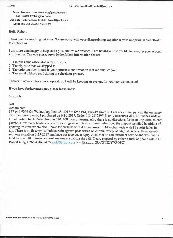 I was really disappointed with Aosom's response. They were not helpful at all and did not take any responsibility for what had happened. I had spent $360 on the awning and had nothing to show for it. I felt like I had been scammed. I would not recommend Aosom to anyone. They take your money and do not deliver the product. It is really frustrating and disappointing. So, if you are thinking of buying something from Aosom, I would advise you to stay away.