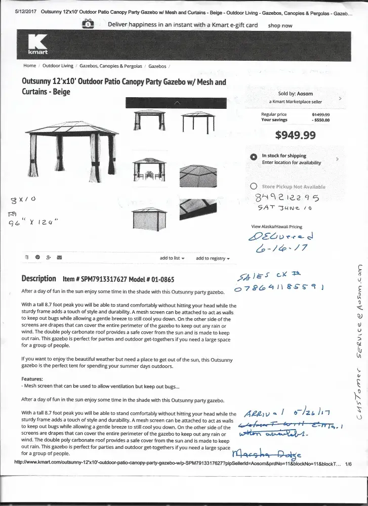 I placed an order at aosom.com for a gazebo on June 8