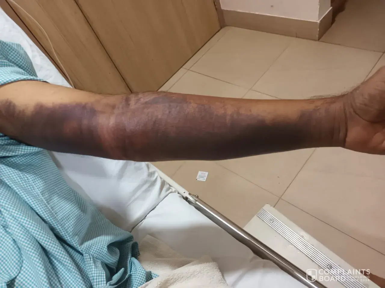 My husband Mr. An. Muthiah Mmhip112006 was admitted in Madurai apollo for cardiac arrest on sunday. On the same day angioplasty done and two stents placed. But till now we are not discharged because of another problem in his left hand which was done in apollo emergency care v were told the intra venus injection was wrongly injected in intra musculer. The patient has blood clot from shoulder to finger and he suffers left hand pain swelling and often fewer. No one reveals the causes of the side effect. We are asking for a report for this treatment taken and the present position of the patient.