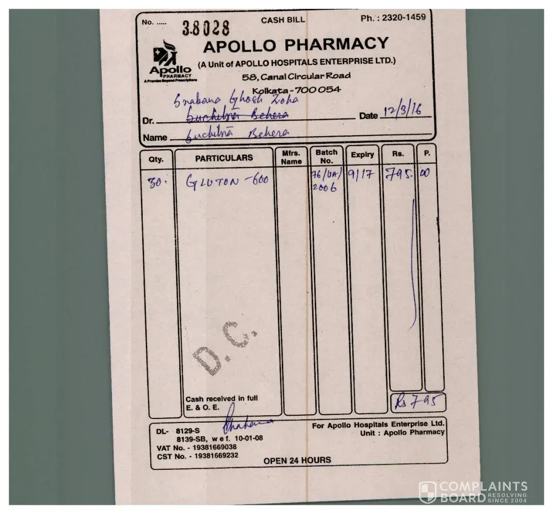 I am registering the complaint against the apollo pharmacy. Recently, I visited Dermatologist Dr. Srabani Ghosh Zoha about my uneven toning on my face. Doctor has prescribed me Medicine - GLUTONE (600) . But the medicine provided to me is - GLUTON 600. Gluton 600 is for completely different treatment and not related to skin at all. I have been consuming the wrong medicine for 4 days. And on 5th day, I was searching about the medicine in the internet and found no clue related to skin problem. I was terrified to see this and immediately compared with the prescription. The medicine was different.Immediately rushed to hospital to get checked with the doctor. And she also confirmed that medicine is different.