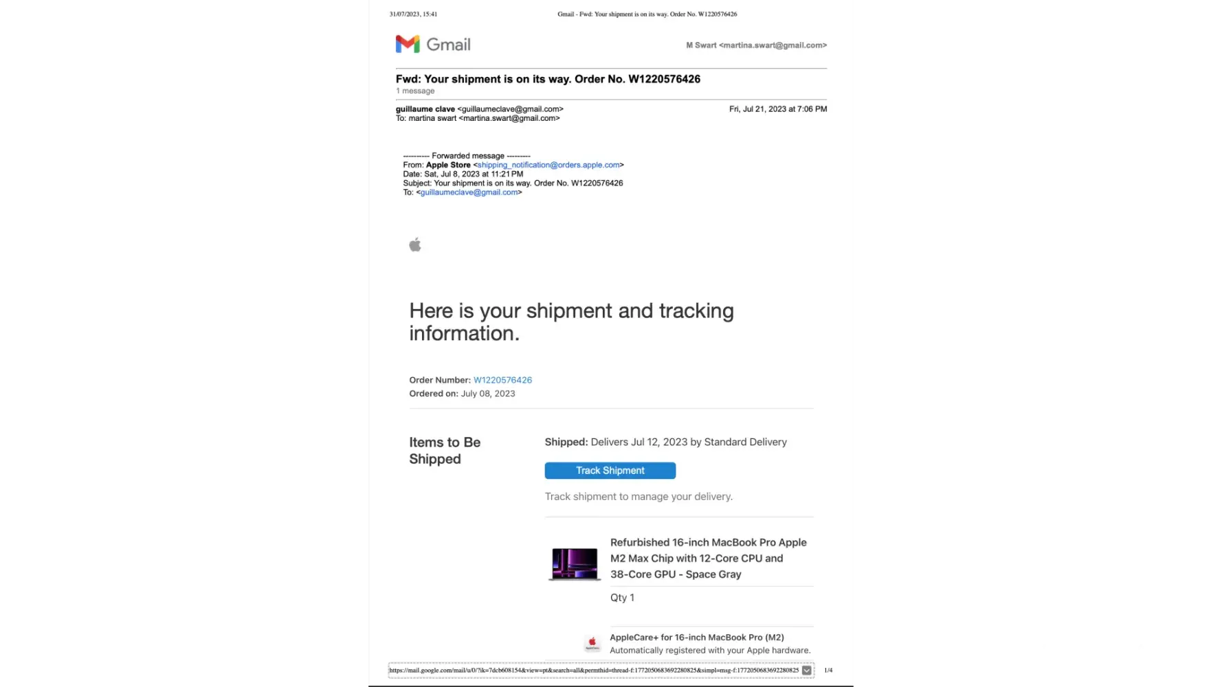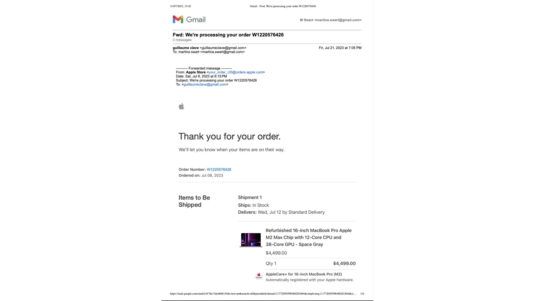 On July 8, I ordered and paid for a Macbook Pro with specifications as per attached. The order included cables and also AppleCare. You billed me for this and also for shipping. Payment for all was done and accepted by you upon placement of the order so I have fullfiled my contract.