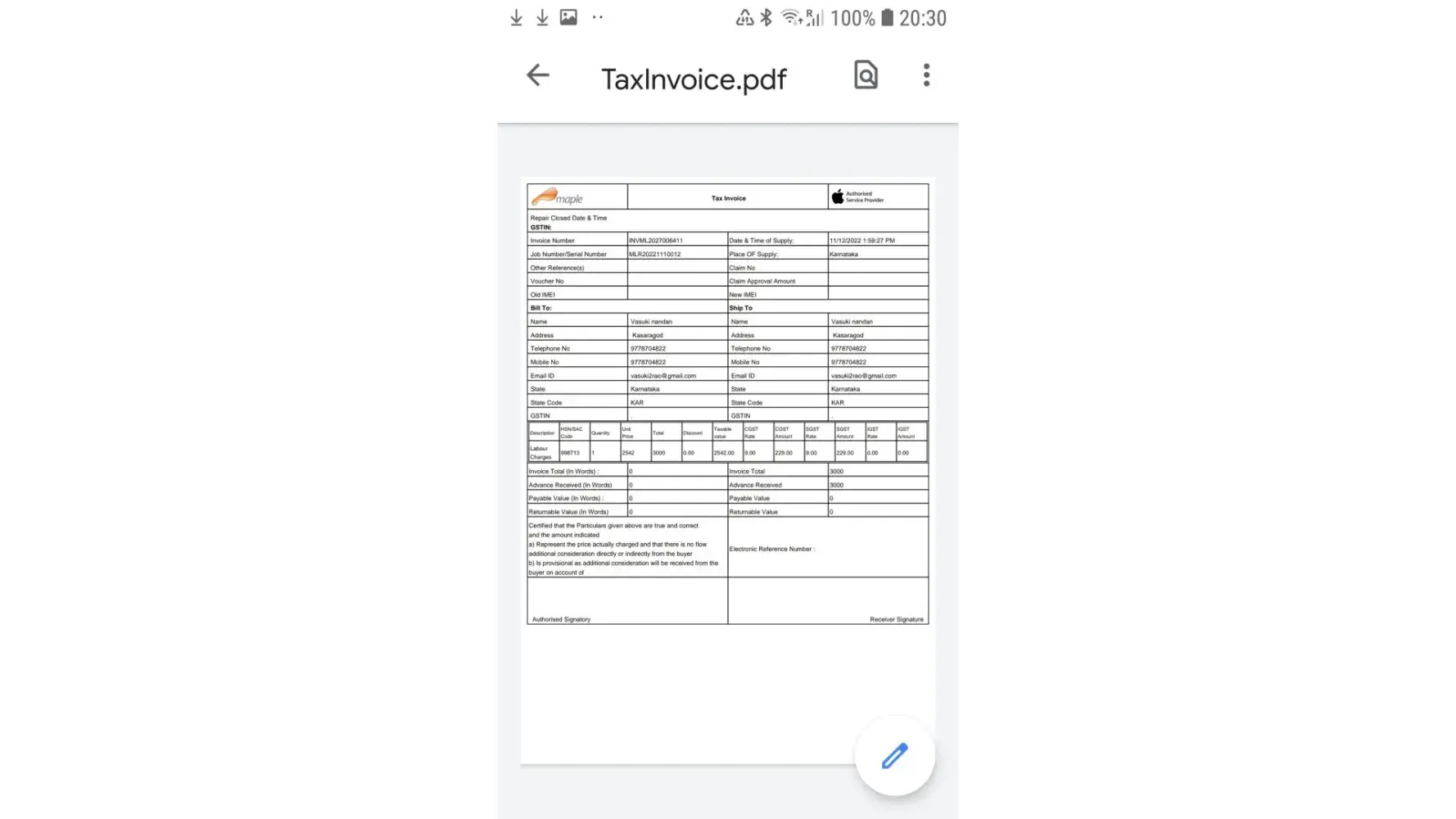 On 12/11/2022 Mac book problem rectified by Maple and refused to return back my advance amount of 3000 Rupees as we proved purchsed reciept of dated 24/6/2022 and provided Tax Invice for 3000 Rupees for returning back my Macbook. (Enclosed Tax reciept issued from MAPLE for the warranty Item)