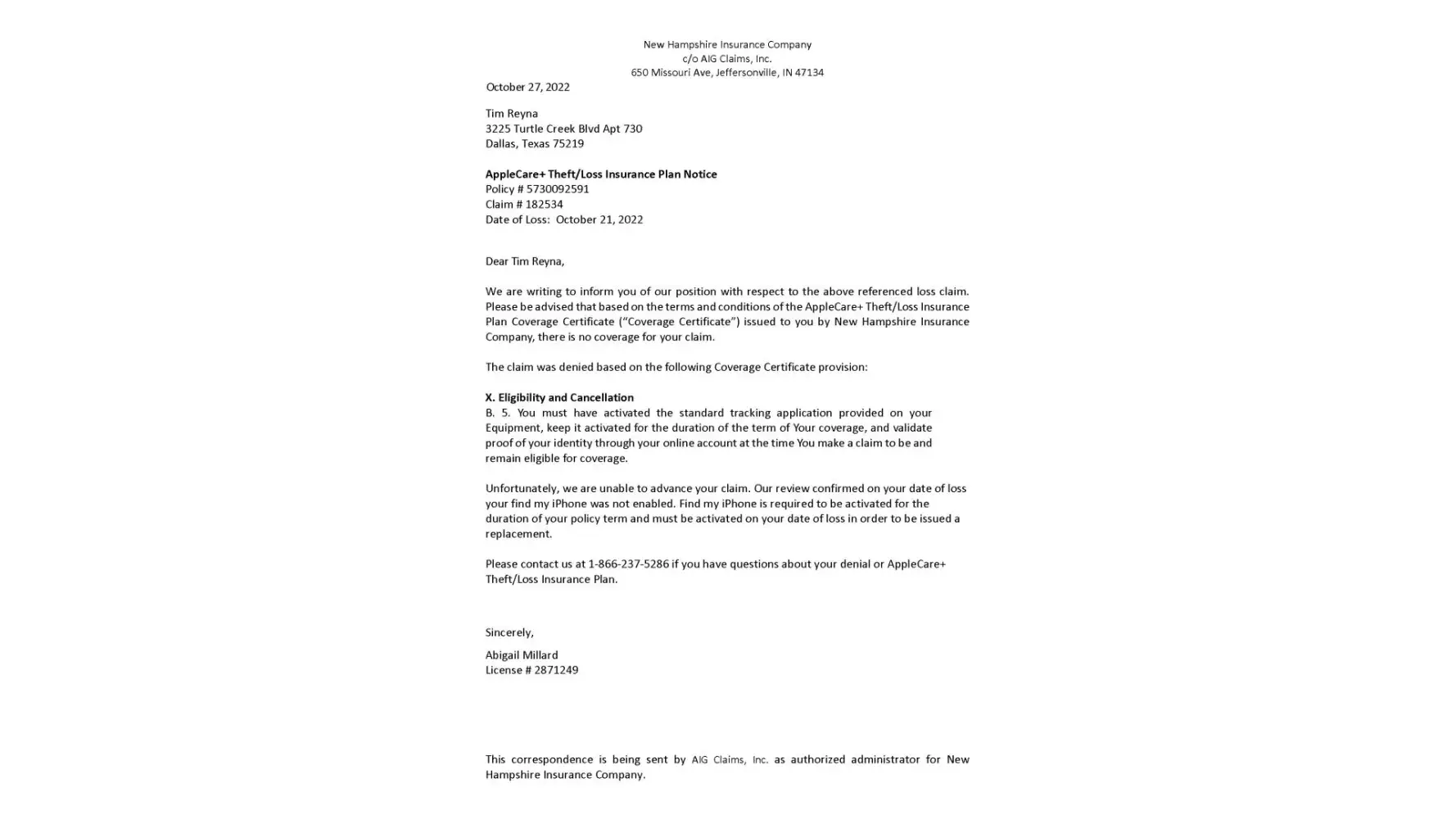 On October 21 I made a Theft/Loss claim on my AppleCare+ insurance through New Hampton Insurance Company and received a denial of my claim because my FindMyIphone was not active. I keep my FindMyIphone active which means whoever took the phone must have found a way to hack into it and turn it off because I do always have to use that feature because of how much I travel on a daily basis.
