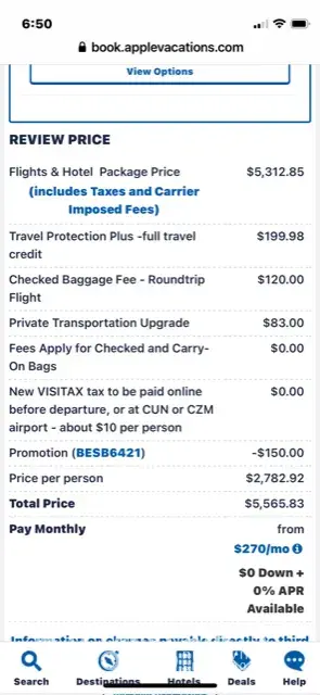 Have reservation with down payment with trip insurance for price match for Secrets Maroma Beach April 19-27, 2022. Price has come down twice in the last week, now at $5565.83. have had 8 conversations, 2 chats and numerous emails with reps and cannot get price to that amount. Down to $5765.83, have no idea where this amount came from. Have tried to resolve with the emails and phone calls, however I am getting no where. The latest chat told me my "issue was being escalated" and I would be contacted. Well, I was contacted via email with an incorrect price as indicated above. They actually asked to send them a screen shot of their own website t show their price last week, still hasn't done any good. I have attached it as indicated. I (we) have been using Apple Vacations for over 10 years and for 23+ trips, never ever had problems like this before when trip prices have come down and called and sked for the price to be adjusted to reflect same. Isn't that the reason for the insurance with price match guarantee!