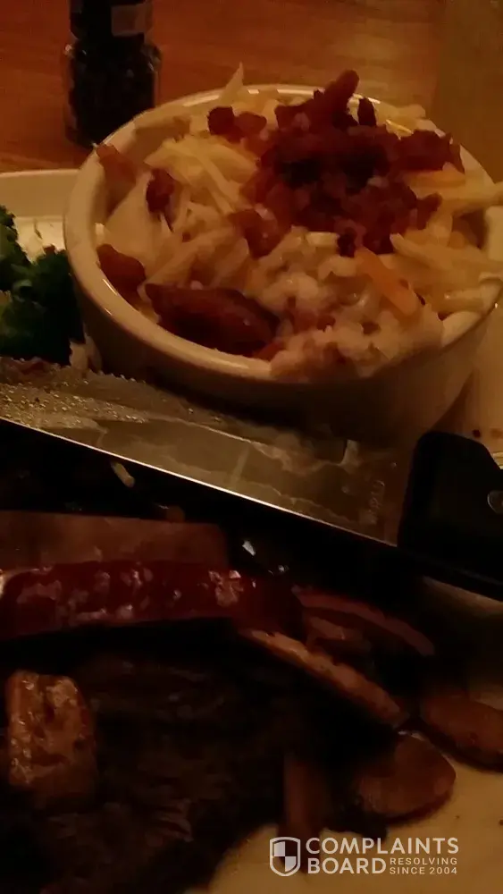 I ate in late night last night. We ordered apps and entrees. I still have my reciept. It was close to closing and our waitress was horrible. She brought unsweetened tea twice and our whole meal we had no drink and when I did get a drink she said drink machines were down and she didn't know what she could do. Our meal took forever to arrive in an empty store. While she enjoyed a coworkworkes engagedment she neglected her guests.Our sides were cold and our steaks were two four ounce steaks instead of 8 oz. When we told her our meals were cold she huffed snatched our plates they heated our plates up scooped the mashed potatoes into a bowl one loaded with cheese that was not to have it on there. off the plate and they were still cold. Our steaks were cooked throughly not the way we ordered our appetizers were sopped with grease and hard. She proceeded to sit behind us staring rushing us out of the table in my opinion she acted as if I was inconveniencing her by the kitchen staff messing up our order there was no manager in sight and I was too frustrated to speak with one. I felt very direspected. I have pictures of the dirty plate. I paid 50$ for a meal that was wrong and I was forced to eat the only thing I had to eat for the day cold and not what I paid for. I'm very disappointed and I frequent this restaurant and I have never experienced such awful service. Any questions feel free to email me.