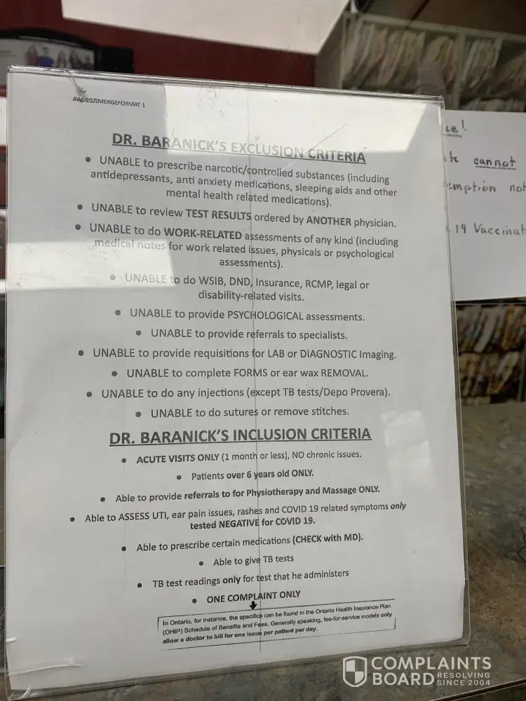 My name is Chris Curry. On May 31st, I visited the walkin clinic at 2150 Robertson Rd in order to get a review of my blood tests for which I had been called back to the clinic. The only doctor on duty, Dr Paul Baranick refused to issue a review of my lab tests. I was told that only the doctor who ordered the lab work could review the tests with me. That happens to be Dr Brien Whalen. When I asked the front desk administration when he would be available, I was told June 15th. I am at a loss for words. So I cannot know the results of my blood work for over 2 weeks. Meanwhile, I am having serious health issues. Ok. Anyways, on top of that, I was issued a prescription and a requsition for xray from Dr Baranick, but when I arrived at the pharmacy, the prescription was in someone else's name. He has issued me a prescription and requisition in another patients name. I'm quickly losing faith in this clinic. In fact, when I looked at the appointment notes on my patient portal, it says "patient left without seeing doctor." How's that for honesty and integrity?