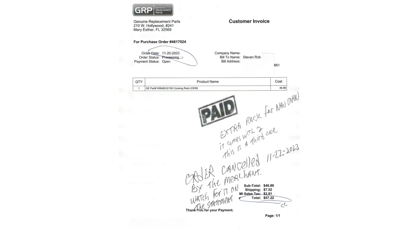 Read full complaintGenuineReplacementParts.com - GE oven rack order