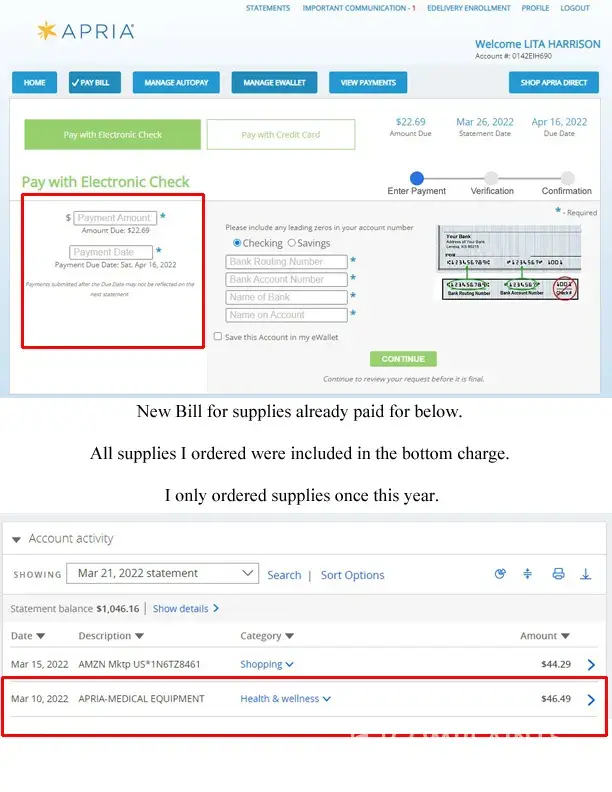 - We got bill of $364.67 in Sept 2021 for service dates 07/24/2020 and 08/24/2020 (More than a year after the service) {Sept, Oct 2021 bill attached} - We discussed this with Apria and they said, this is the final balance, and if you pay, your due will be $0 - Apria sent the bill to collection agency for these dates during the same time, which we paid on on...