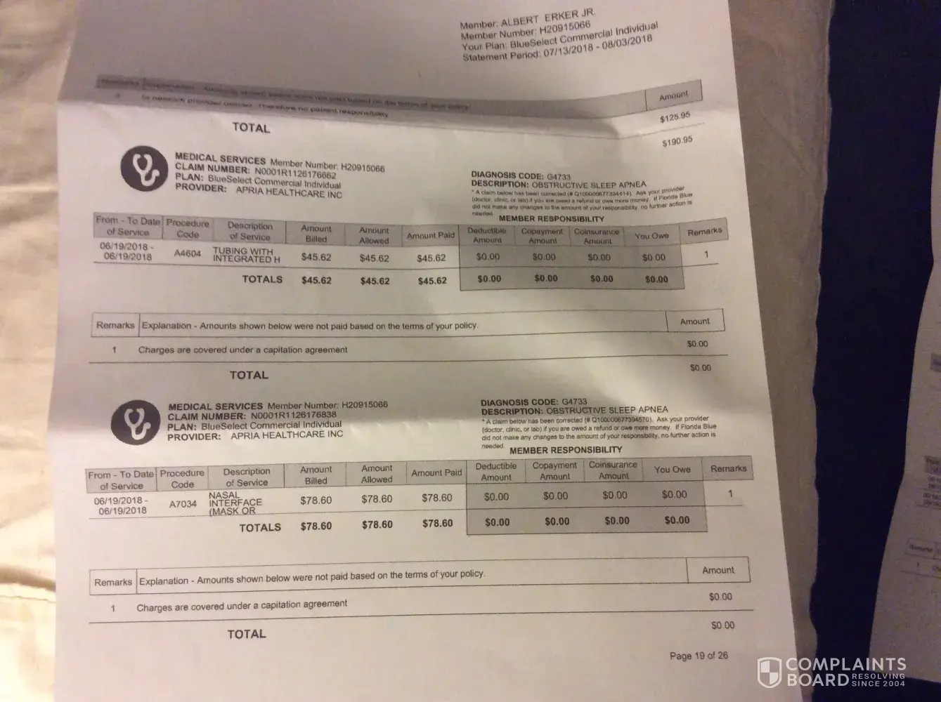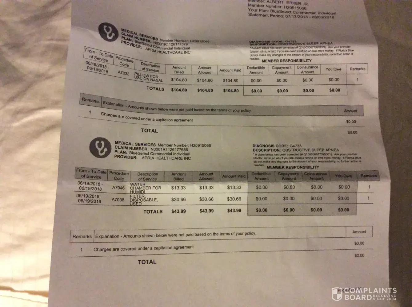 3) in my phone call to apria they were very snotty and said that blue cross had paid their portion but there was no proof in the statement. I asked for a detailed invoice and all I received 2 weeks later was an inter-office document with no detailed information.in addition the information was very confusing and hard to match up to the few packing label I did receive.