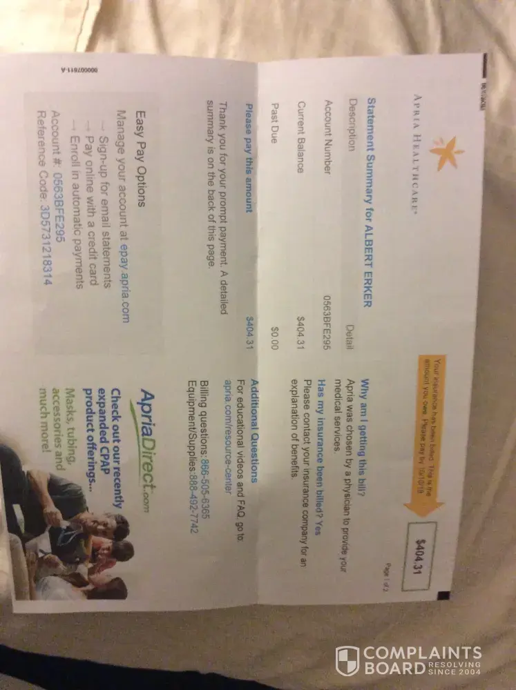 Very interesting. They have been demanding payment stating my insurance was filed. I called. They are stating that they filed claims and all claims were rejected. Yet the insurer has no record of ANY claims being received and/or rejected and Apria cannot provide written evidence of any claims being made. In addition Apria told me to have my insurer call them to explain the claim problem...only problem is that none was received and if rejected that would be due more to a filing error on Apria’s part.