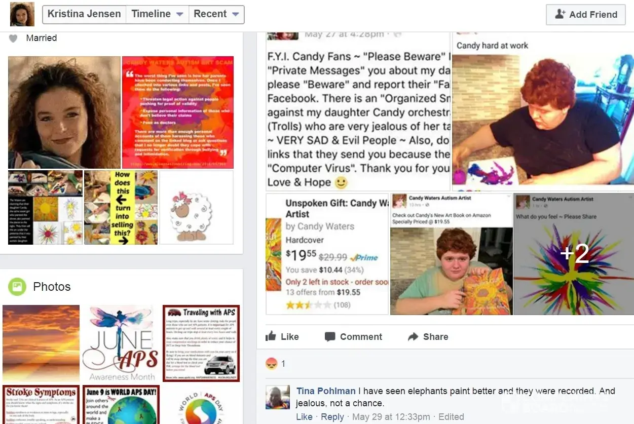 Ms. Tina Pohlman and her Minions follow the Waters family around in facebook groups for two years now using fake identities and attacking them on the post of their daughter's paintings that they are proud to share. Also, Ms. Pohlman and her Troll Team have created many Fake Blogs, Videos. facebook Pages, Memes & etc filled with Lies & Hate about Candy Waters