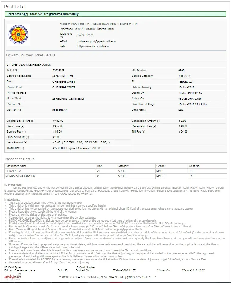 I traveled from Thirupathi to Chennai on 17th 02:00 hrs. The ticket was charged 500 Rs for 2 persons whereas the normal fare is only 350.