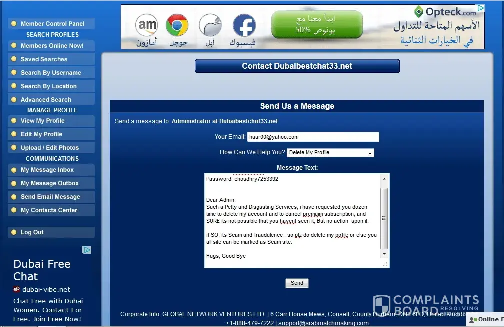 Arab match making, UAE singles, Dubai friendship site and dozen others to name etc, etc. are all the part of the same network, amazingly enough about half a dozen at the time of writing this email are being advertized here on the very same web site of http://www.complaintsboard.com and I don't know who is running them exactly and how they can be stopped but such web sites are now showing the failure of internet's controllability due to its enormity and automation. Why I am saying this is because those relationship sites mentioned above are being hosted in countries outside united states and/or Canada and they have either bots setup to reply to newly uploaded profiles of the users or their fake profiles are being controlled by the network services agents abroad, just like in a call center who are paid to send you fake winks and emails even though if you don't have your full profile there (though call centers are legit businesses).