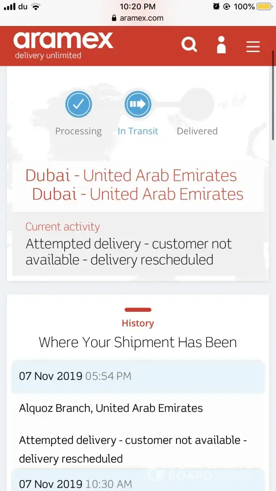 7th November, Thursday, 10:24am - i received a call from aramex re my parcel. I informed the person on the other like to deliver between 4-5pm as i will be in the office (delivery location in JBR) at that time.