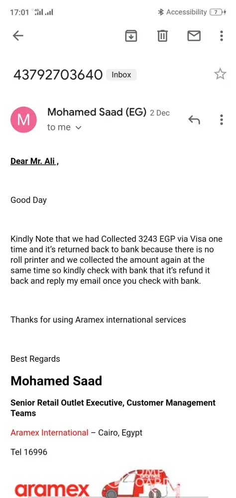 I'm really disappointed with Aramex Egypt service.