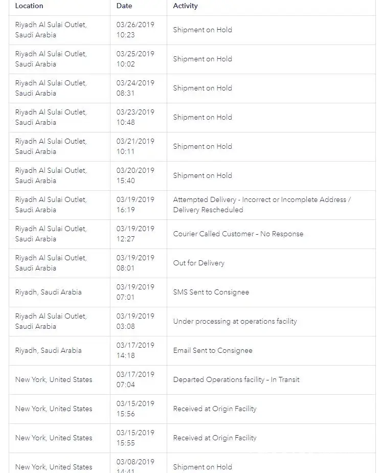 Hi, I have used Shop&Ship Services to buy laptop from USA and bring it to Saudi Arabia-Riyadh. They have received my shipment on 8th of March, and hold 1 a week at New York due to High Value shipping issues after a week we solved and they send to Saudi Arabia. from 17th of March, even I have received out for delivery message, they didnt deliver my shipment from a week showing as HOLD. I have contacted many times but not get any positive and clear explanation. They are just saying that it is custom and we well try to clear! I could not understand how any material can be out for delivery and then again Custom? See attached tracking history and please somebody warn this Riyadh Aramex unprofessional staff since they are now working in vision of Aramex.