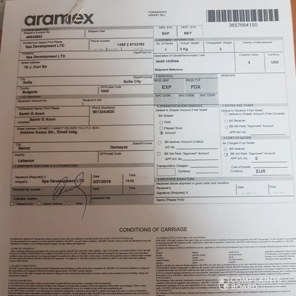 Our office in Sofia told us that aramex Bulgaria confirmed that the reimbursement amount should be above 150$ since the shipment cost is written on the shipping document for 95 Leva equal to ;47.5 euro .