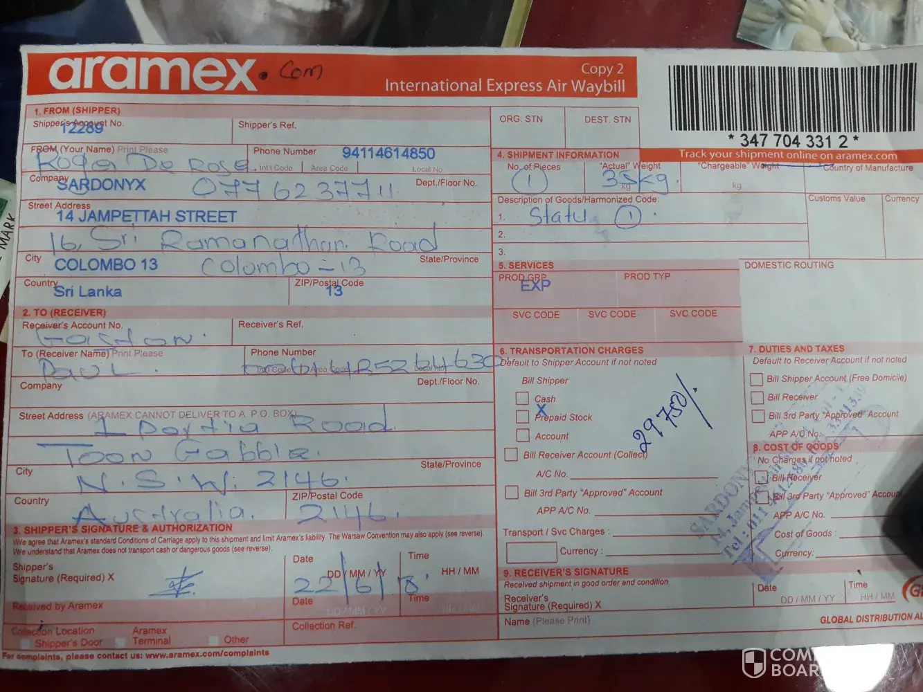 I sent a parcel containing a statue of our lady on 22/6/2018. through your agent sardonyx, 14 jampettah street, colombo 13.