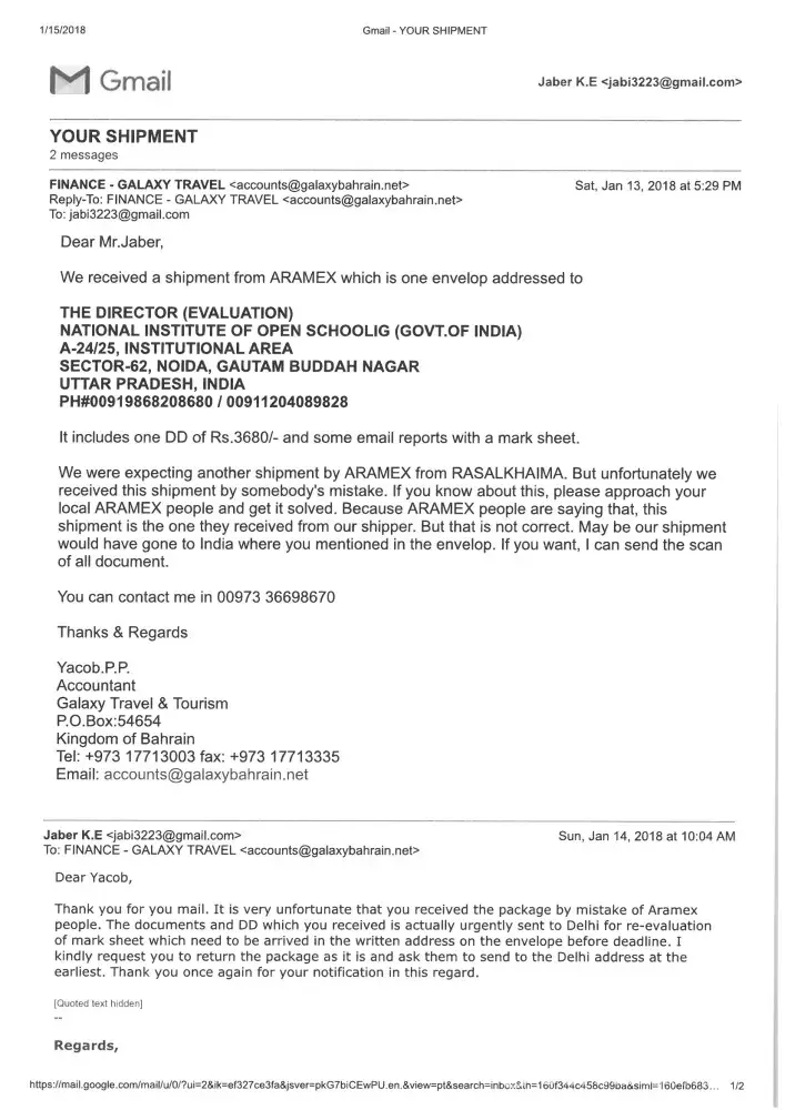 Please be noted that the shipment under Air Waybill No: [protected] which I sent on 10.01.2018 from Fujairah UAE to Noida-India has been delivered to one address in Kingdom of Bahrain and the docs sent by someone to Kingdom of Bahrain delivered to the NOIDA address.Please note that the right docs are need to be reached to the concerned address by 16.01.2017 as it contains application for exam re-evaluation which will be rejected if it is not delivered on or before deadline. I contacted the local aramex office in Fujairah but no action is taken to my knowledge. Please do the needful to deliver the documents by 16.01.2018 and if Aramex fail to do so, I may take legal actions.