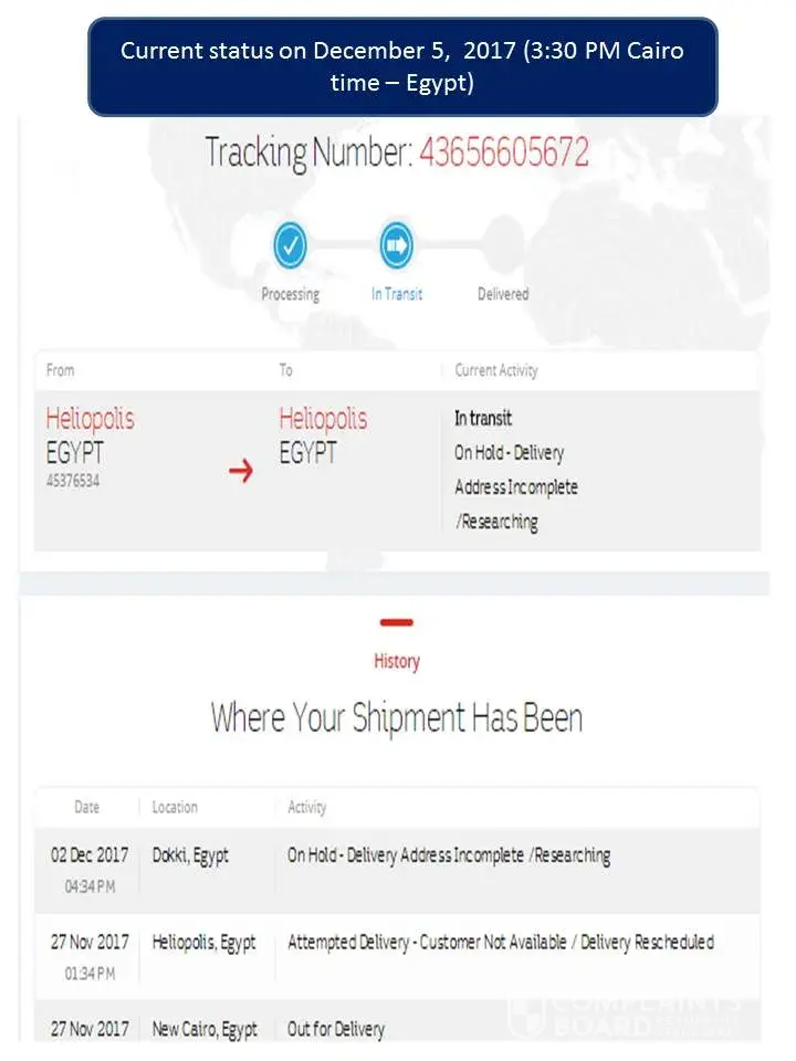 I attach a print screen showing the most current status of the shipment highlighting that their statement on "incomplete address: is not correct especially they delivered one part of the shipment on December 01 at the same address. Thanks in advance and look forward to hearing from you.