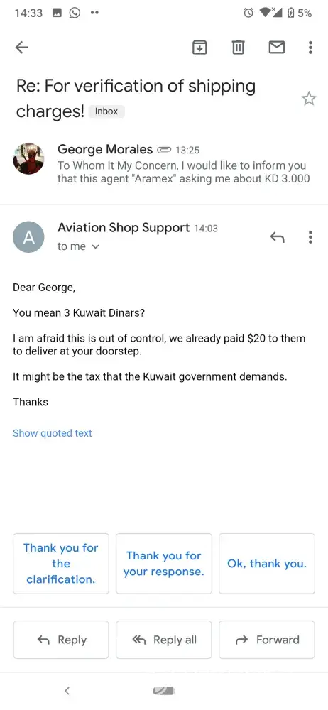 I was confused and not agreed with your Aramex shipment charge for the amount of KD 3.000 Kuwait dinar, since the main shippers paid it already in the amount of $20.00 dollars only.