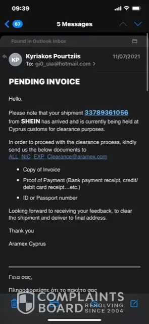 I am attaching screenshots of the email i sent to Kyriakos proutziis on the 12th and screen shot of the date since when my parcel is in Cyprus but not yet delivered.