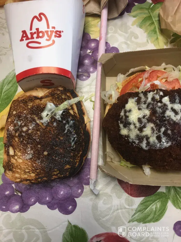 Service, of food way over done, & wrong fries on first time, in picked up, got right fries but when she got home, are chicken sandwiches are burnt & buns are also, as picture below shows. I called arby's manager gives to excuse that chicken waas different & cook different, as you can see in picture its just plan burnt (all 3 sandwiches) at this time, we're...