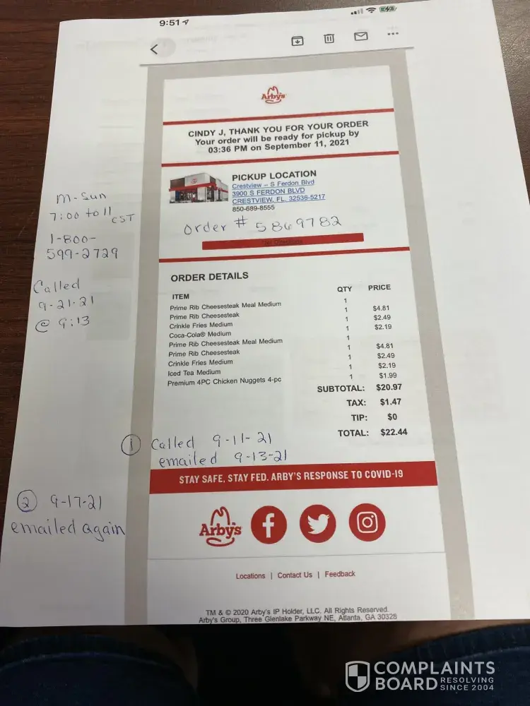 10/01/2021 we visited arbys at 2501 little rock rd.And as we entered the drivethrough and they already had five cars waiting. We made our order at the pull up window and ordered two chicken sandwiches and fries and two cokes, when we recieved the order the chicken sandwiches had two chicken nugetts on bread, and sandwiches were cold and fries also. Thi...