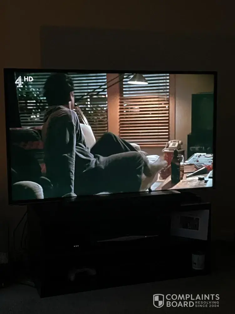 We proceeded to plug the television in and noticed that there were dark patches in the corners and an obvious line from one side of the screen to the other.