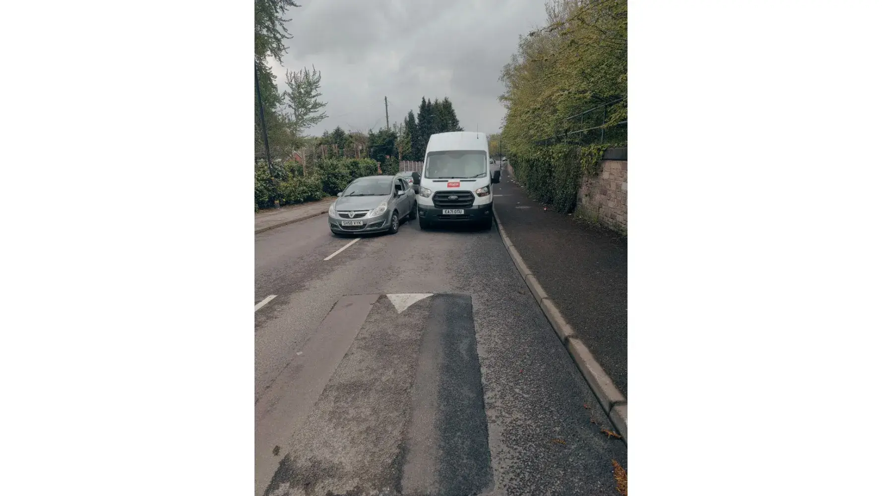 Saturday 22nd April 11:40 Urmston Manchester Reg EA71 OTU parked up, close to a mini roundabout junction on a railway bridge overpass - oncoming drivers blind to the fact that vehicles are trying to pass your driver's long wheel base van on the wrong side of the road...when confronted by other road users as well as myself - couldn't care less.