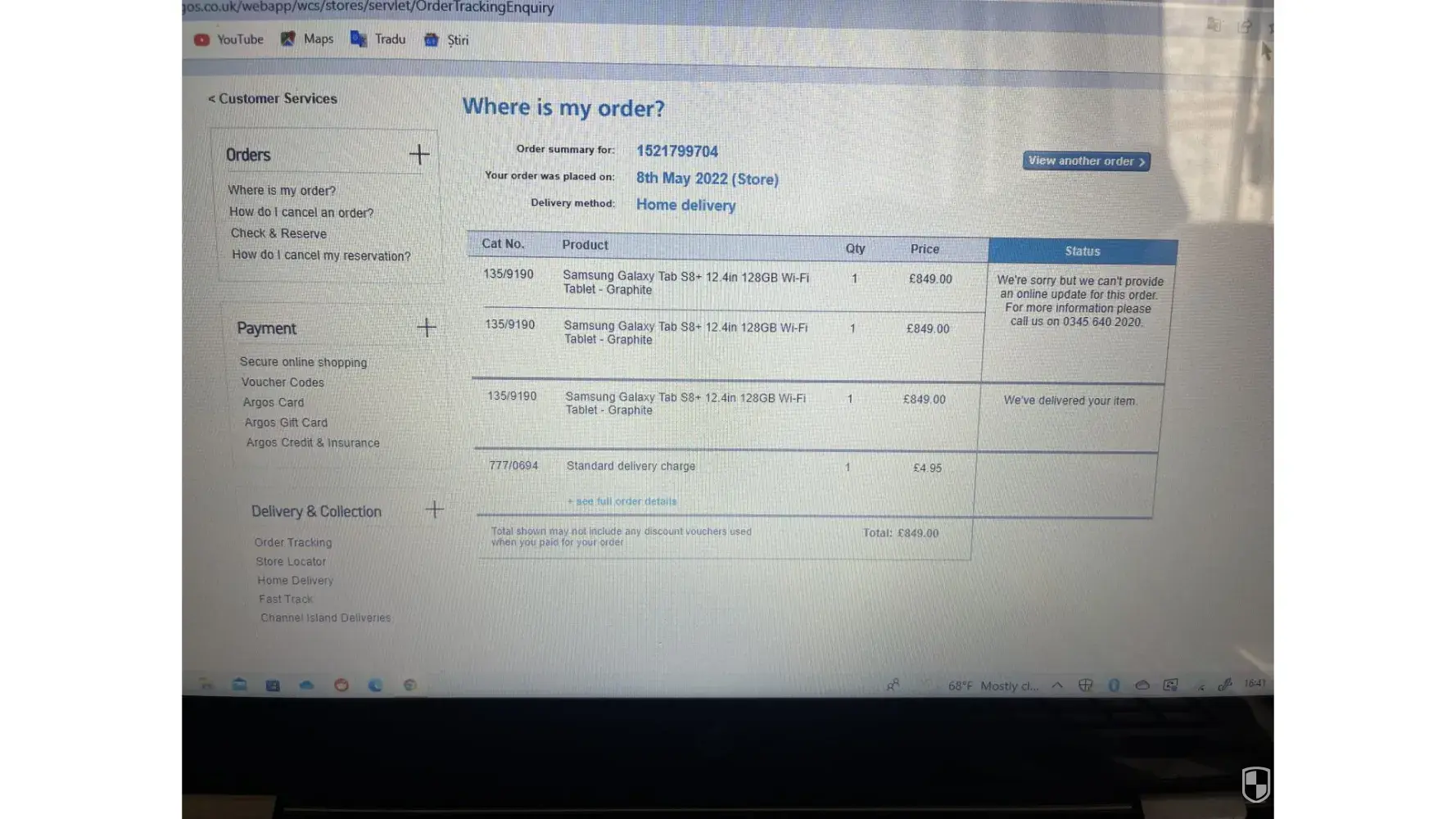 I waited for my order for a week and I didn't have it, the driver says he came to my address twice but didn't call me because my phone number was wrong and then went back to the warehouse with my order. I tell you that the order was paid more than half and the rest of the payment I wanted to make with my Argos card, in installments every month. But I can't pay this order if it wasn't delivered to me, someone has to help me recover my Samsung Tablet. Thank you. My no. phone is [protected]