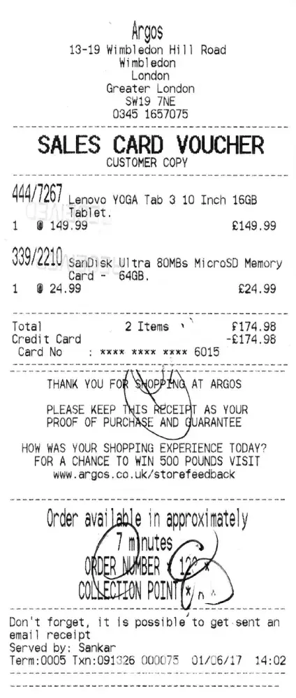I bought a Lenovo YOGA Tab 3 in London on the 1st of June 2017 from Argos in Wimbeldon at 13-19 Wimbledon Hill Road, SW19 7NE.