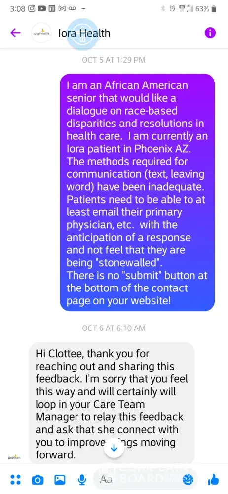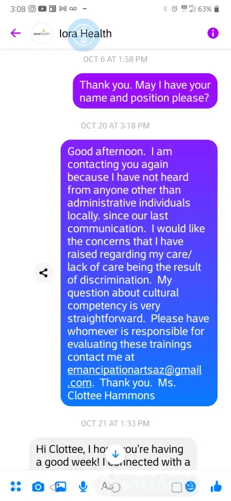 I later spoke with Ms. Darling's Director (Diane/no last name given), however it was clearly perfunctory. I was inquiring about how I might escalate my experiences and concerns; however a process of accountability was. I therefore reached out to Iora on Facebook Messenger and was advised to contact your office by the anonymous responder that answers inquiries on that platform. [Those messages have been downloaded. ]