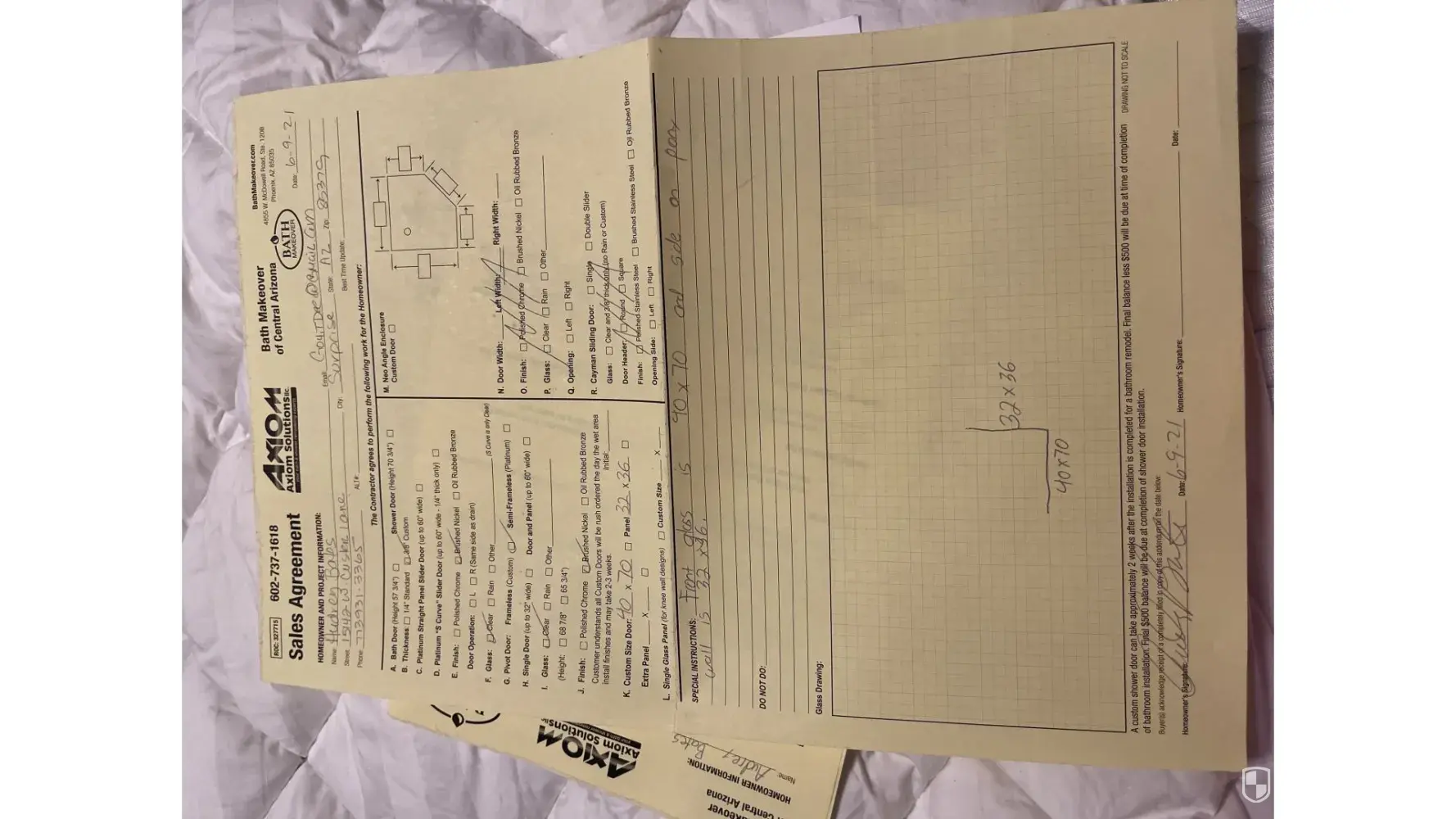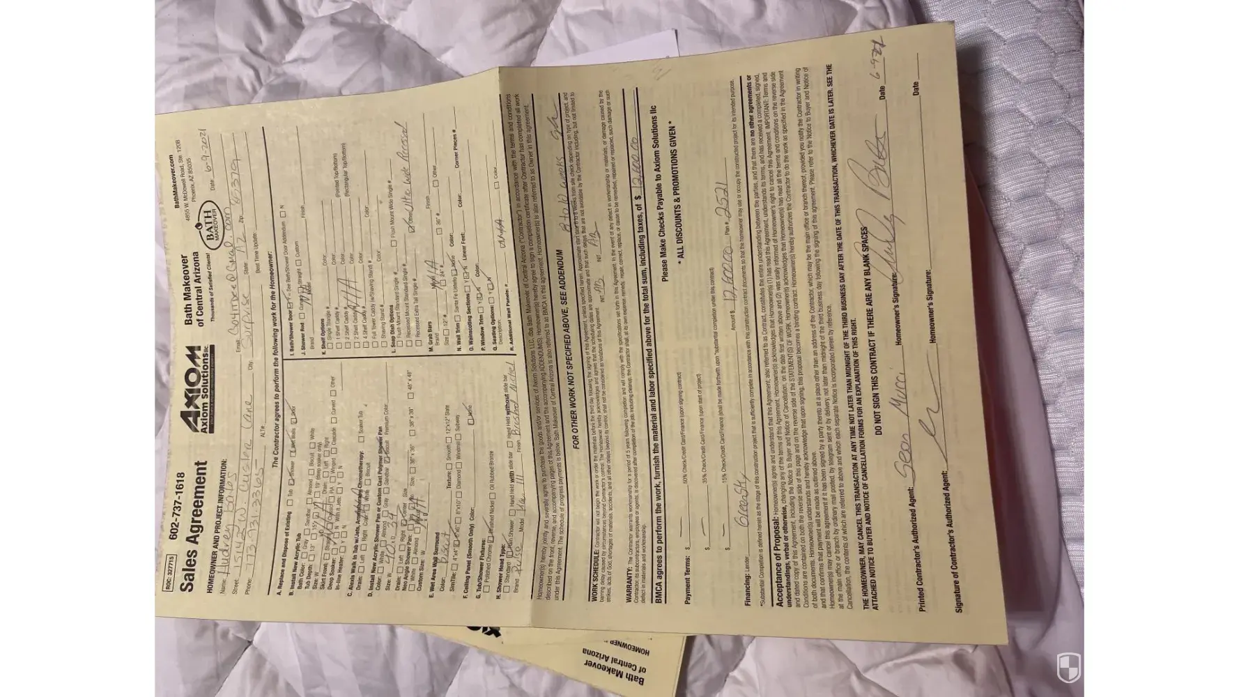 On june 9, 2021 bath makeover/ axiom sent sean there sales person to give me an estimate on completely gutting my current shower and instaleing a new shower with a rain drop shower head an nickle plated fixtures and installing new tile in shower and double plated shower glass all around along with new counter tops with double sinks and nickle plated fixtures to match the shower, bath makeover took out a loan with greensky under the name on anderson for 12600.00 and took 6500 out of it immediately. I was promised by sean the sales guy it would be completed in 8 to 10 weeks, I informed him I needed it done by christmas... As of today 02/04/2022 nothing has been done... I have tried contacting them over and over again, spoke with 2 managers jenna and dave lopez, still nothin... I asked them to cancel since they breached the contract they said they will keep 33 percent of loan. I am currently paying interest on loan