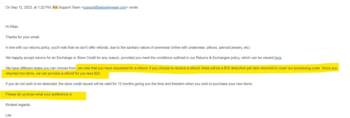 Not only does Ark swimwear have the worst customer service team, but their terms and conditions are disgraceful. I have never purchased from a company where faulty items are not refunded.