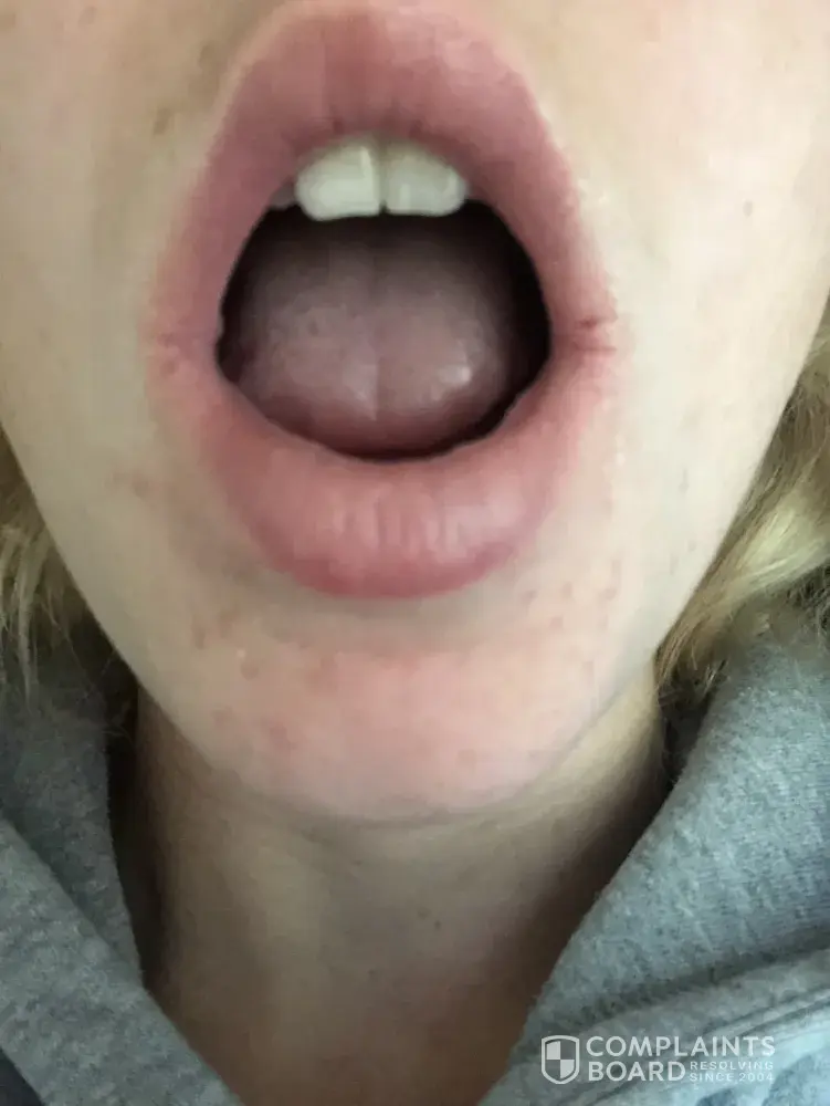 I began using it about a week after my cleaning. The first couple of days were fine. On about the fourth day I woke up with my tongue swollen, which was a bit disconcerting. I had also noticed that my throat was very dry throughout the night while I slept. I experienced progressing symptoms over the next couple of days, such as swollen lips, gums & further back on my tongue. I also noticed small ulcers under & on the sides of my tongue, and sores in the corners of my mouth. It was all excruciatingly painful, including not being able to eat or talk well.